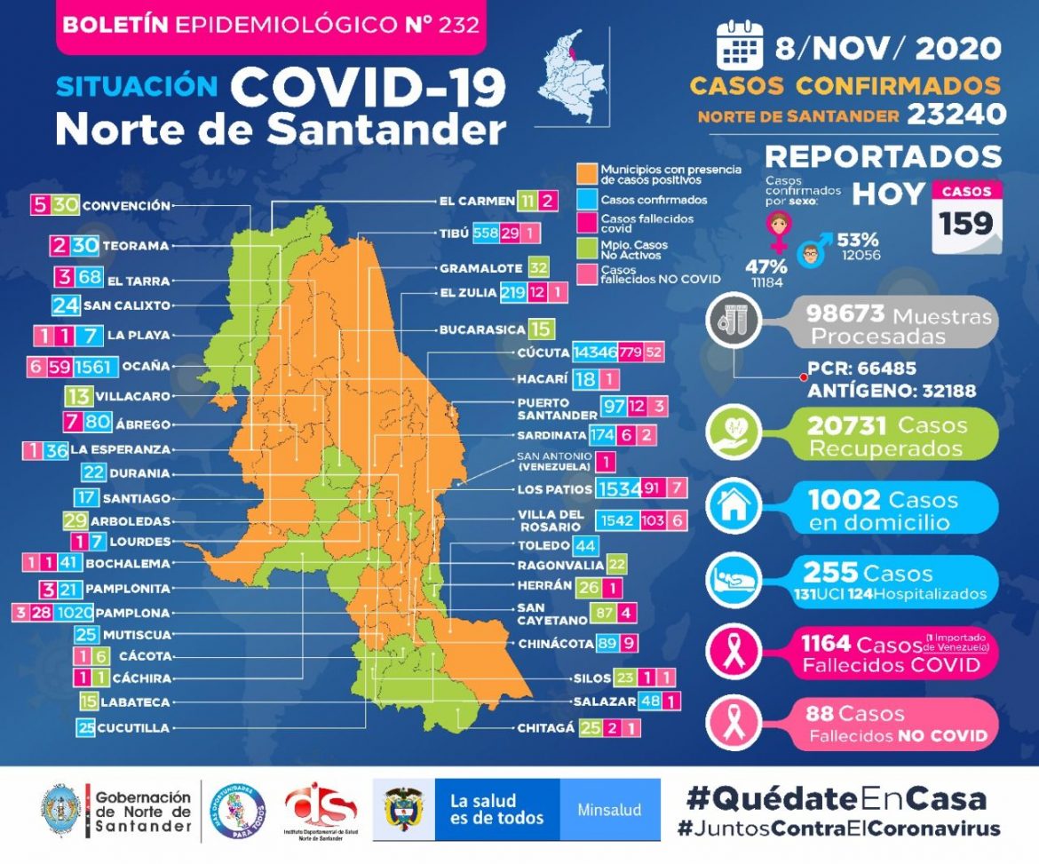 La cifra de contagiados con coronavirus en el departamento ascendió a 23.240 casos. El Ministerio de Salud y Protección Social confirmó ciento cincuenta y nueve casos más de COVID-19 en Norte de Santander.