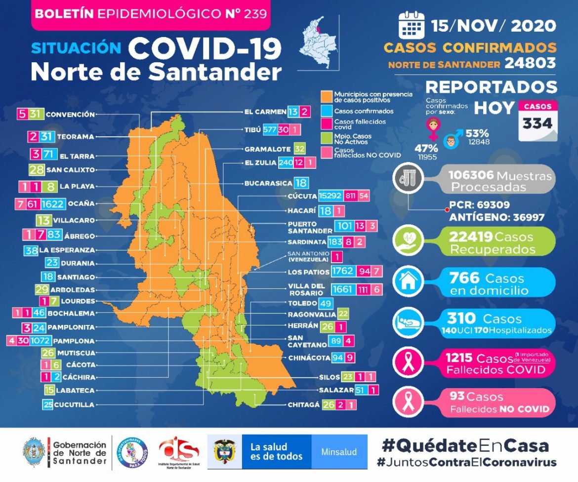La cifra de contagiados con coronavirus en el departamento ascendió a 24.803 casos. El Ministerio de Salud y Protección Social confirmó trescientos treinta y cuatro casos más de COVID-19 en Norte de Santander.