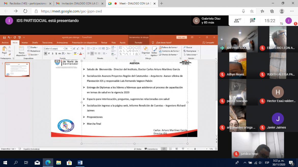 Al interior de la videoconferencia se presentaron los avances de los proyectos que se están realizando en la región del Catatumbo y al finalizar se abrió el espacio para el diálogo con la ciudadanía donde hubo participación activa y se adquirieron compromisos de acompañamiento a los veedores para el caso del municipio de Sardinata teniendo en cuenta que se encuentra adelantando la construcción de la IPS.