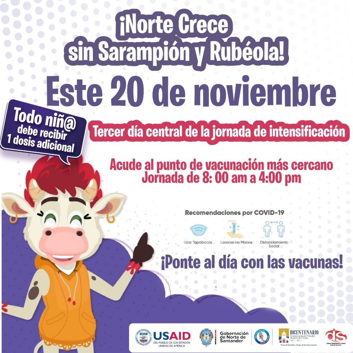 Este sábado 20 de noviembre en los 40 municipios del departamento se activarán todos los puntos de vacunación, por tal motivo, la Gobernación y el Instituto Departamental de Salud, en cabeza del Dr. Carlos Arturo Martínez García, invitan a toda la comunidad nortesantandereana a participar activamente de esta actividad por el pro de nuestra infancia.