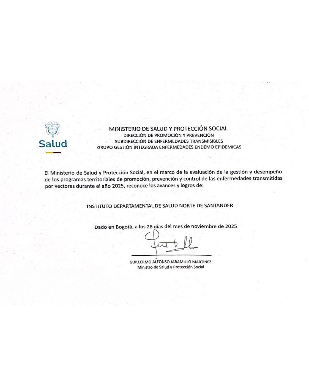 El Instituto Departamental de Salud de Norte de Santander (IDS) obtuvo nuevamente el primer lugar a nivel nacional en la gestión del programa de promoción, prevención y control de enfermedades transmitidas por vectores, otorgado por el Ministerio de Salud y Protección Social.