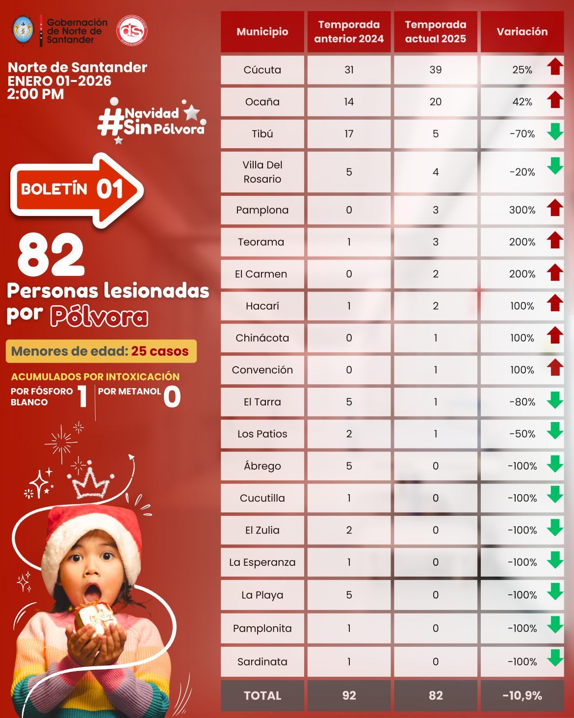 El Instituto Departamental de Salud de Norte de Santander informa a la opinión pública que, con corte parcial al 1 de enero de 2026 a las 12:00 del mediodía, se han registrado 82 personas lesionadas por el uso de pólvora durante la temporada decembrina y de fin de año 2025–2026, 25 de ellas menores de edad.