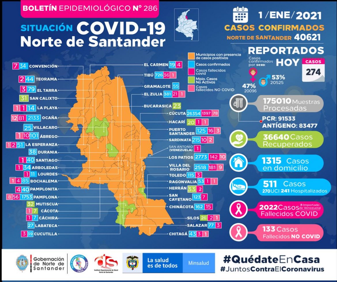 La cifra de contagiados con coronavirus en el departamento ascendió a 40.621 casos. El Ministerio de Salud y Protección Social confirmó doscientos setenta y cuatro casos más de COVID-19 en Norte de Santander.