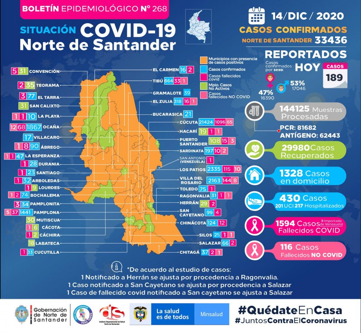 La cifra de contagiados con coronavirus en el departamento ascendió a 33.436 casos. El Ministerio de Salud y Protección Social confirmó trescientos cuarenta y nueve casos más de COVID-19 en Norte de Santander.