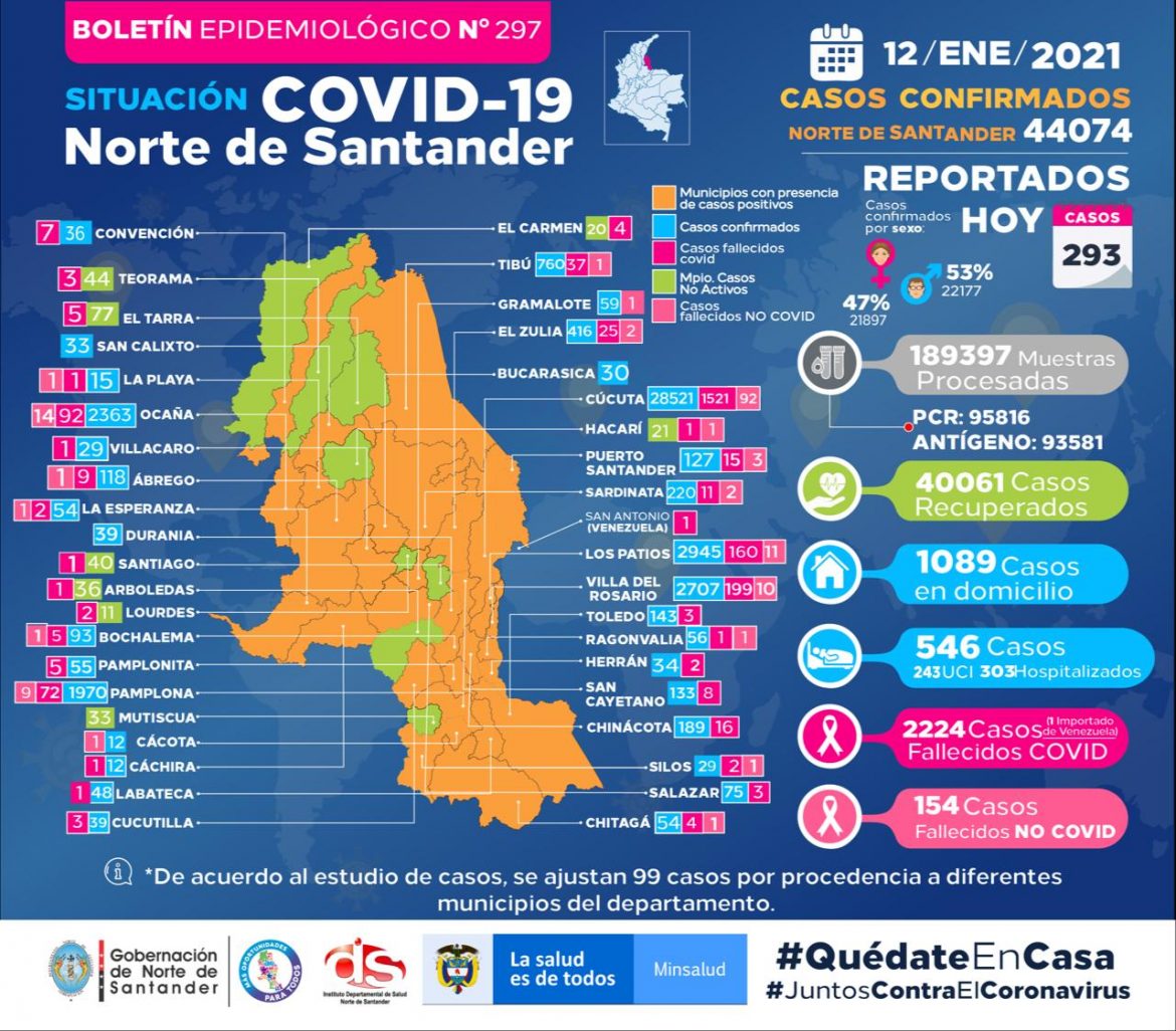 La cifra de contagiados con coronavirus en el departamento ascendió a 44.074 casos. El Ministerio de Salud y Protección Social confirmó doscientos noventa y tres casos más de COVID-19 en Norte de Santander.