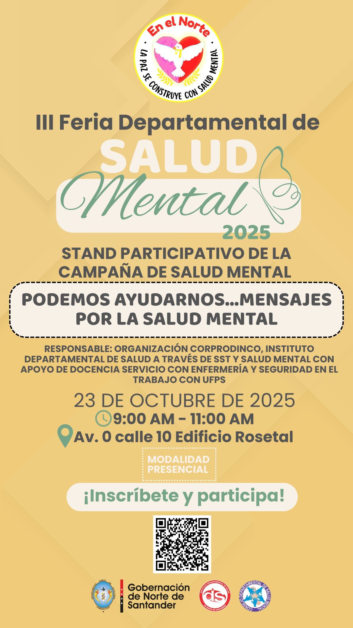 La salud mental dejó de ser un tema silencioso para convertirse en una apuesta colectiva por la paz, el bienestar y la convivencia. Con ese propósito, el Instituto Departamental de Salud de Norte de Santander dará inicio este 30 de septiembre a la III Feria Departamental de Salud Mental, bajo el lema “En el Norte, la paz se construye con salud mental”, con una programación que se extenderá durante todo octubre en distintos municipios del departamento.