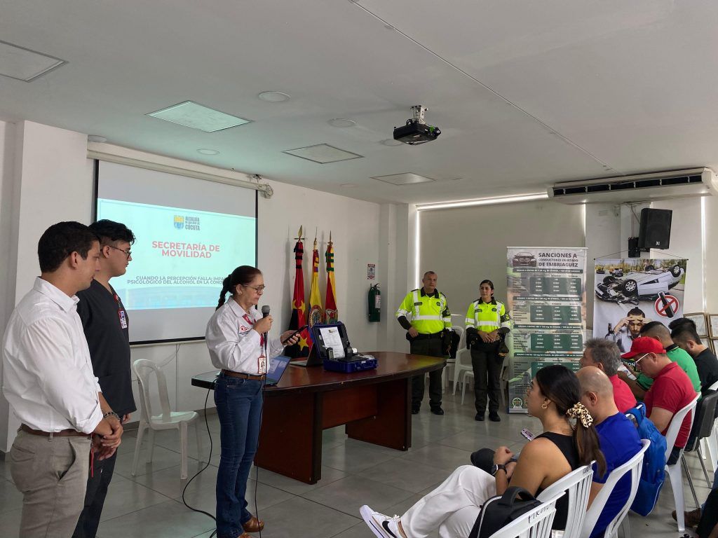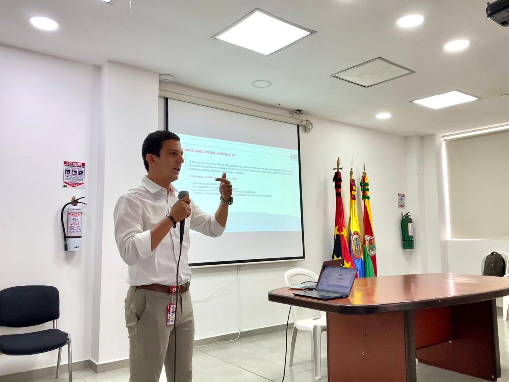 Allan S. Reyes M., psicólogo de la Secretaría de Movilidad de Cúcuta, quien abordó el régimen de multas y las medidas contravencionales. Camilo Poblador Bayona, abogado de la Secretaría de Movilidad de Cúcuta, quien explicó la responsabilidad jurídica del conductor.